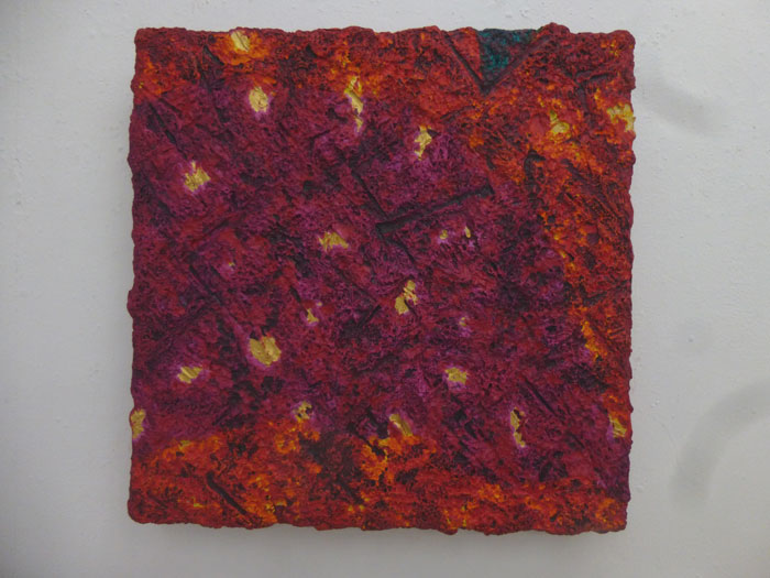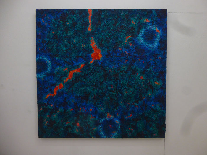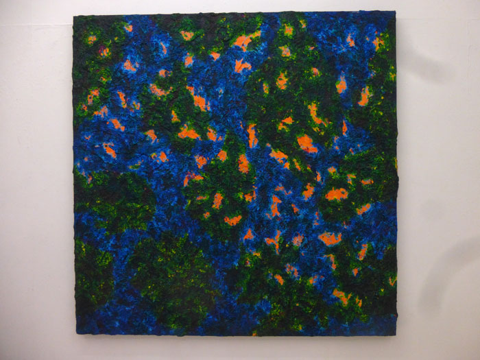 能古島という自然の中で展示されている作品が都会の小さなスペースに展示され逆に作品が森を作ったようになっています。こんな面白い展開になるとは意外でした。能古島で見られた方は別の視点から面白いと思われるかもそうでない人はこれだけでも面白いと思います。木材に孔を穿ったアキライノウエ。詩を書いた作品大瀧純、布をボックスにした神崎東洋彦、木に貼り付けたシルクの作品木寺正喜、立体の小西龍太郎、キャベツの斎藤秀三郎、木枝に加工した首藤マヤ、新しい表現を追及する若い写真家長谷川治胤、黒い円錐ボックスの中からはみ出す不思議な布のオブジェはやし史、ステンドグラスのオブジェというか3メートル近い高さのガラスの柱松尾雄一、木とラップによる彫刻みたいなオブジェ光と透明の面白さを作品、綺麗な色の染色で作られるオブジェ風の作品吉原みずゑ氏達の作品の響き合いを楽しんでください。