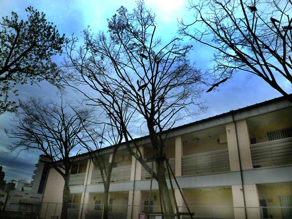 鳩に餌をやるおじさんに棒切れで追いやられる鴉達、反撃を企むが、おじさんが長い長い棒で寄せ付けない。そこで地上から樹に移動して待機、!でもおじさん強くて鳩が食べ終わるまで監視、からすは「か-ぁ」と鳴いてお山に帰って行きました。