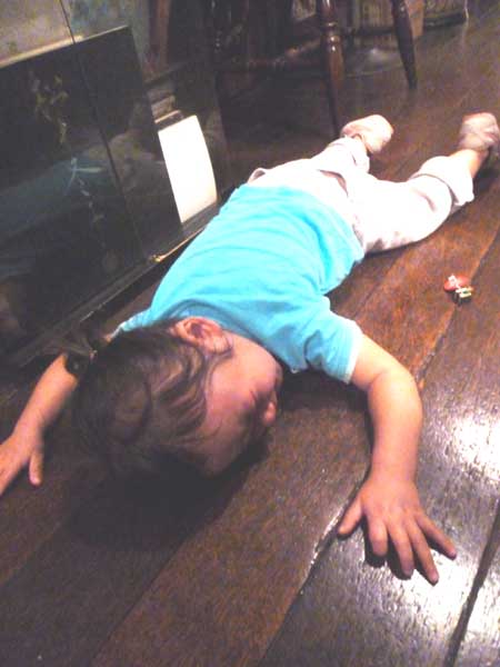 あやね!駄々こねる!獏、最年少のお客さん!1.5歳。何かが気に喰わない、床に張り付きスパイダーマン!