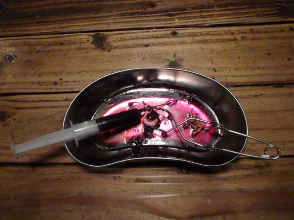 「渾身の作!」 先日、獏で行われた前衛舞踏「ミシンと蝙蝠傘」の小道具にとキタムラケイちゃんが作ってきたものですが製作中にナイフが滑って腕を13針縫う怪我をしてしまいました。ちょっと気味が悪いけど渾身の作品になったみたい!いつか彼女の写真作品に登場するでしょう!愉しみです。