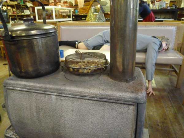 共星の里で撮影後さむさでぐったりの夕希ちゃん!その横で暖かいストーブの上ではじけるピーナツ!美味しかった!