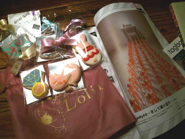 磯辺美香ちゃんに北村ケイちゃんと獏ちゃんがコラボした写真集を送ったらこんなにお返しが届いた。京都のお土産「匂い袋」、ローリー(美香ちゃんが責任者)というショップのクッキー、それに東京の若い芸術家の情報が満載の雑誌!クッキーをかじりながら楽しみました。