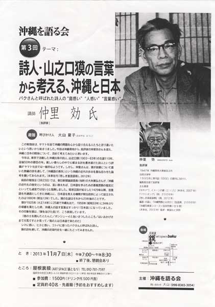 「山之口獏の言葉から考える沖縄と日本について」批評家、仲里効さんを迎えてトークをします。