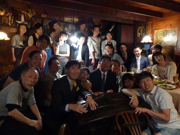 「おもてなし」 今日は律子さんの古い付き合いの友が東京から帰ってきて結婚式を獏は二次会に指定されました、で皆揃って、貘のユニホームでお出迎え。そして集合写真にも潜り込みました。中央の幸せそうなお二人が新婚さんです。