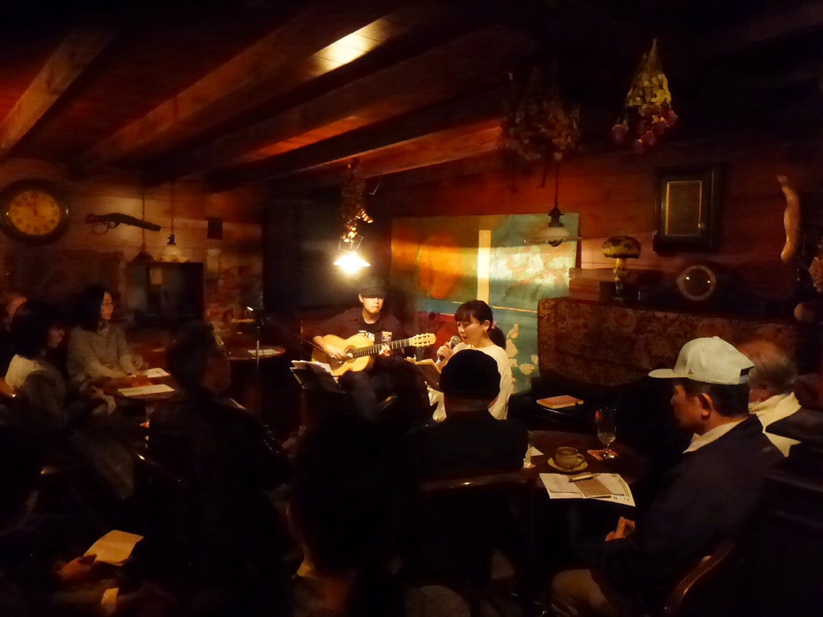 「夢語り千夜」 今晩は、語り部の靜さんとギターの波多江さんによる詩と散文の世界が展開されています。満員です。