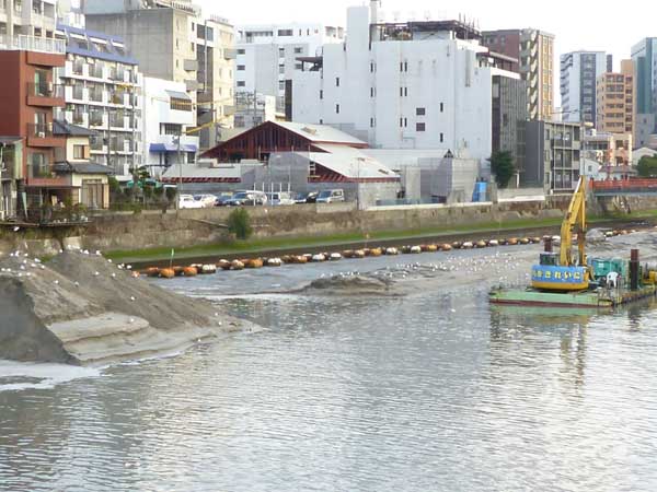 那珂川の六軒屋橋付近では最近,川の整備工事が行われています。古い民家とビルが立ち並ぶ傍での川の工事。川底をさらって進化(遊覧船を運行)しようとしているのか老化を防ごうとしているのか?川の流れのように人の営みも流れていく!