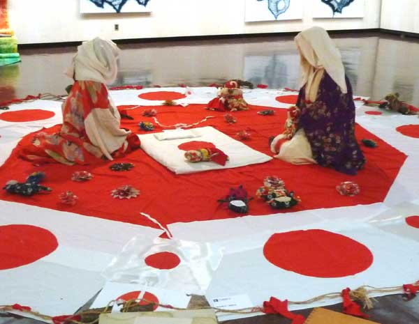 佐々さんは画廊全体を使ったインスタレーション、大浦さんはファンタジックな柔らかな透明感溢れる絵画、末藤さんは今、アートスペース獏で個展開催中。ヨーロッパや日本の古布を下地に独特の色彩感覚でペイント、下地の模様とマッチして謎めいた作品に!主にインテリアっぽいインスタレーションが多かったが今回は平面作品になっています。彼女達の間で何が話し合われているか謎ですが来年が楽しみです。