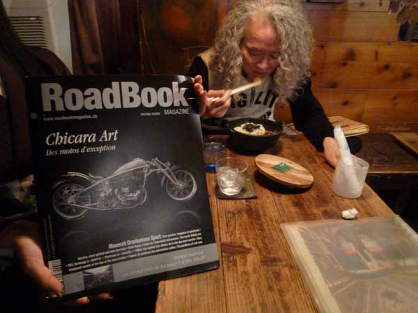独自のバイクを創り上げる「CHIKARA」さん!最近スイスの大手企業からオファを受けて展示会をしました。そのバイクが本になりました。「CHIKARA ART」として紹介されています。一生懸命、屋根裏弁当を食べているの本人さん。佐賀から仕事を終えてやってきたので腹が減っているのでしょう!