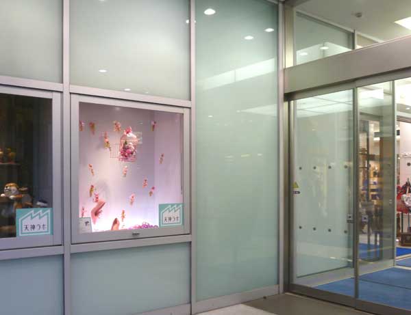 有里ちゃんに次いでピンキ-・ミカこと磯邉美香ちゃんの作品がパルコの入口のショウウィンドに展示されています!キューピー?風の小さな人形が空を舞っています!今年も獏での展示は終わりました。その作品は今。東京・明治神宮外苑のブースに出品されています!大活躍です!