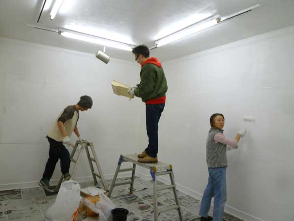 アートスペース獏は2012.12.27日で今年も終わりました。若手作家のホープ、冨永剛君と柴田高志君に手伝ってもらって画廊のペンキ塗り、贅沢なお手伝いさん達の助けで律子さんも頑張っています。今年も終わりました。来年も宜しくご贔屓のほどを!来年は面白い企画が一杯で