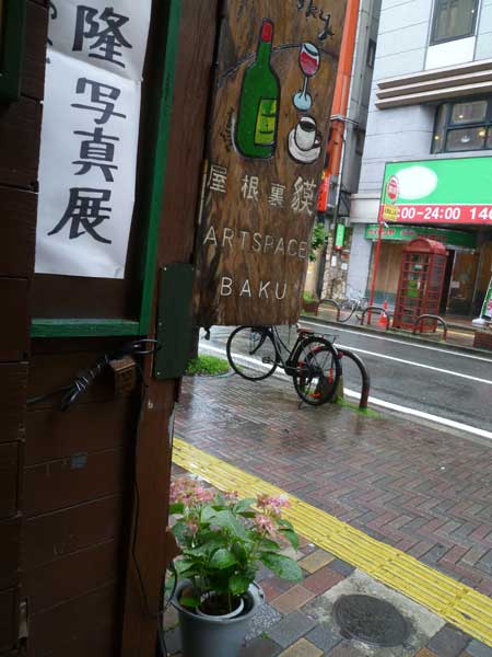 獏の看板下の紫陽花。雨に打たれて元気になるかと思ったら首を垂れてきた!温室育ちなのかな?雨と紫陽花はお似合いだと思ってるのに!