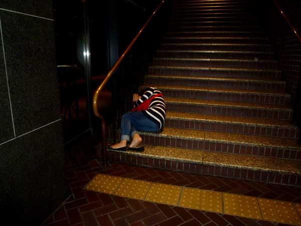 午後11時45分頃、地下街の階段で心地よさそうに眠っていた可愛い寝顔の女の子!楽しい夢でも見ているのだろうか笑っているように見えました。15分後には地下の警備員のおじさんに起されただろうな?