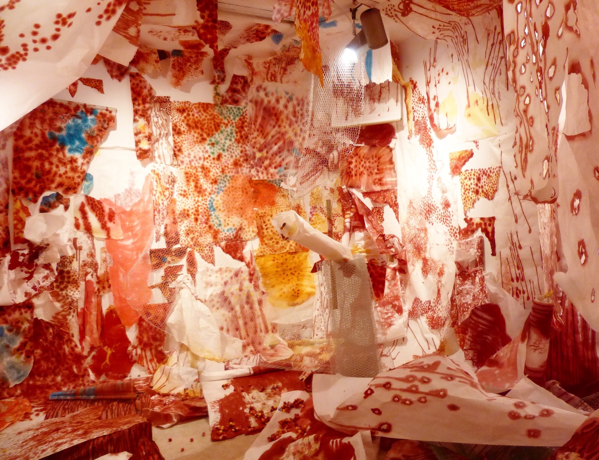 心的消化のため、あるいは初めの花 というタイトルです。画廊全体がオブジェで飾り付けられて子宮をイメージしてしまいました。そしてそこから始まる女性の葛藤と生き方を思い起こすと同時に貘ちゃんは居心地の良さを感じました。