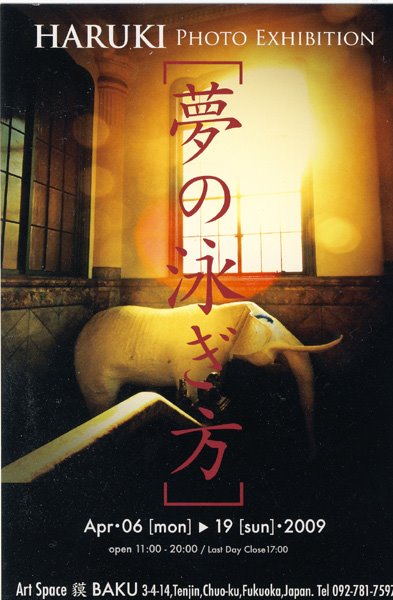 カラーによる作品20点。今時、カラーとわざわざ言わなくてもと思いますが日常にある風景、光景がHARUKI氏の色彩感覚によって現実離れしてしまいます。夢か幻か?写真という現実を切り取る技法が色によって非日常的に変換してしまう。いや現実は色付きなんですがそこの色をほんの少し超えたところに異次元が存在することを教えてくれます。
