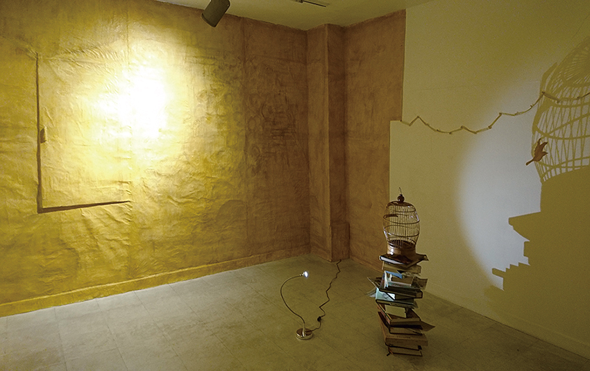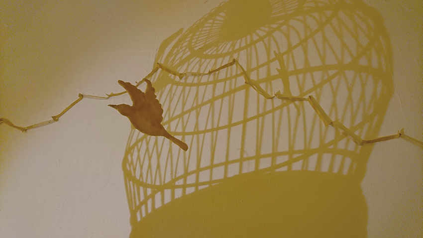 さらに、画廊の床には分厚い十数冊の本や写真プリントが積み上げられその上に置かれた空っぽ鳥籠が、小さなスポットライトの光によって大きく歪んだ淡いシルエットとなって、先の稜線と重なるようにして右手の壁に映し出されている。そしてその手前の、飛ぶ鳥もまた影絵かと思いきやそうではない。蜜蝋でこしらえ吊り下げられた薄い鳥型なのである。