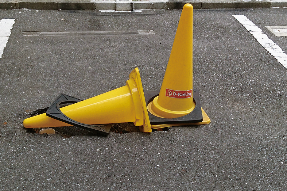 いずれにしても、カラーコーンは大地に根ざすことのない現代の空虚なデラシネに違いない。先端の高みよりもさらにその低みよりも下にあるはずの支えは無く、空洞それ自体が小さな塔としてのカラーコーン。でもこれは、ほとんど私たちのことかもしれない。ただそれは立っているか倒れているかの違いにすぎないのだ。むしろ無傷であろうとすることに、私たちの日々の極度な不自然さやアーティファクト化するこの現実を見る思いがするのだ。
