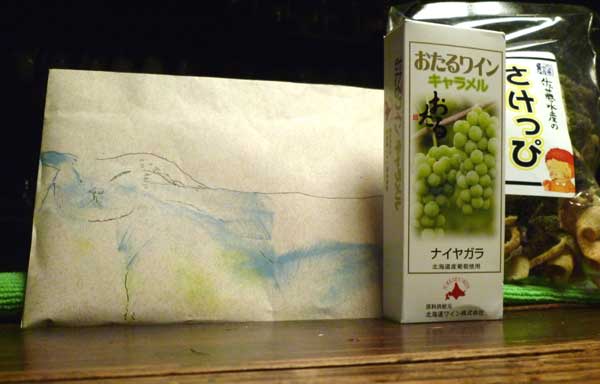 『北海便り」 今日、北海道の小林重予(作家)さんから便りが届き、鮭の皮の揚げ物。酒のつまみに最高の「さけっこ」そして小樽の葡萄キャラメル!葡萄の味が効いていて美味い!そして重予さんのイラスト!グル?