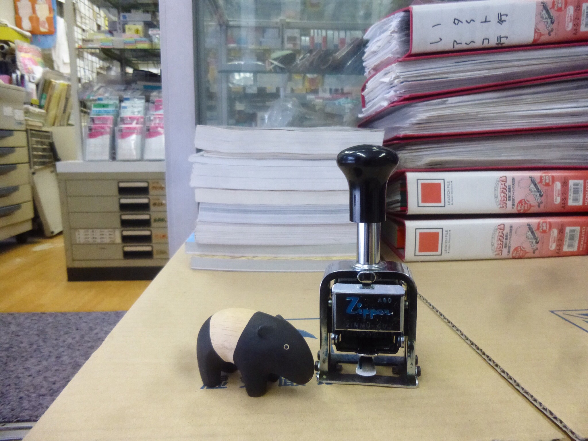 「お勤めご苦労さん^ - ^」 40年間、打ち続けたナンバーリングが遂に退職です。ご苦労さんと事務器屋さんに持って行きこれと同じ者を下さい^ - ^と、でも生産中止でした。新しいのを買ったら事務器屋さんが大事に飾りますので下さいと言われてあげて来ました。貘ちゃんもお別れを惜しんできました。 http://artspacebaku.net #cafe #photo #garally