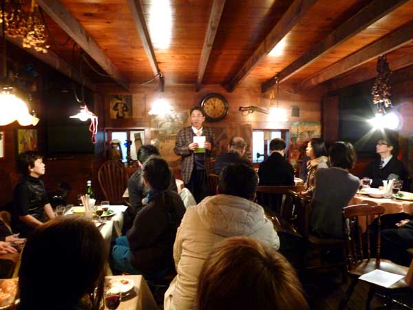 阿部文範氏の「菜園便り」出版パーティです。津屋崎の海岸前にある旅館を舞台に書かれたエッセイ。切ない、悲しい、ことや楽しい人とのつながり、おかしさ、ジョークあり、一日の日記におちがあったり、そして菜園を潤す野菜たちの会話。上質な映画を見ているようです。