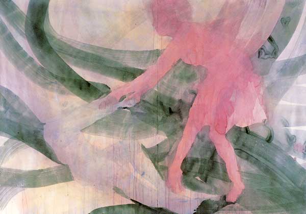 「やわらかな圧力」がタイトルです。店を抜け出して見て来ました。水彩画と木炭を用いた壁画がいいです。絵の具の滲みや溜り、筆の痕跡、水分によってたわむ紙,描かれた身体の僅かな動きや自然が産む偶然の効果も味方にして作品が創られています。