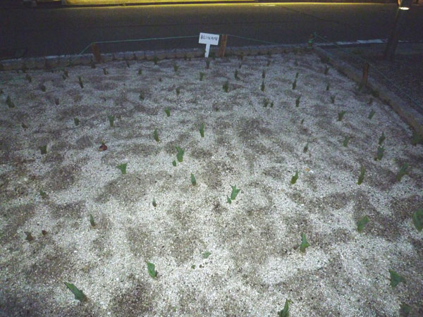 グルと一緒に散歩する公園に植えられたチューリップの球根から芽が出てきた。春吉2丁目の子供たちが植えたチューリップです。植えた、当時は何もなく、春が来ると土の中から! 寒くても春は来ています。