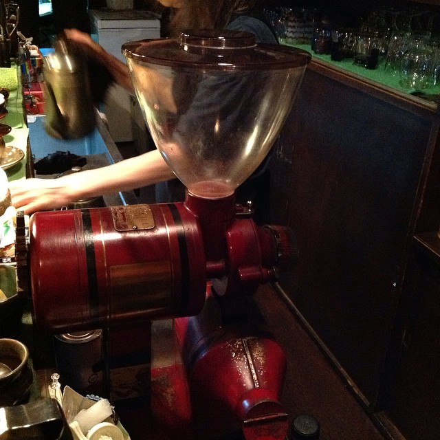 ストーレートコーヒーをコヒーミルで挽いて珈琲を立てている律子さん。長年使いこんでいるミルで淹れるストレート珈琲はうまい!