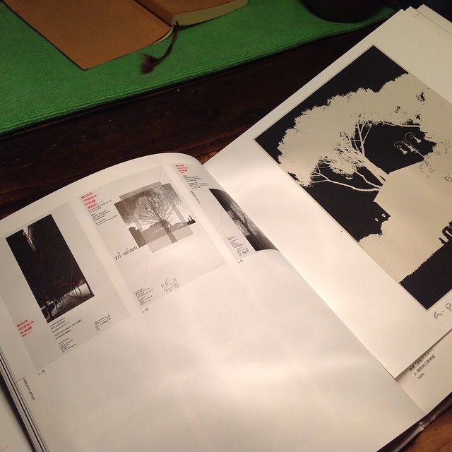 #河地先生の退任記念作品集と版画を貰いました。左側が先生が貘で個展された時のポスター!右側が版画。ストーンヘンジをモチーフにした作品です。よかです!!