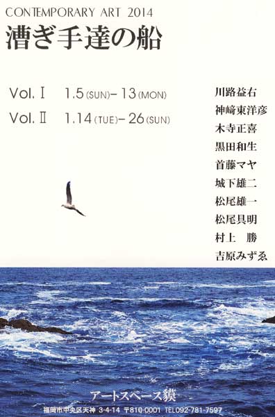 期日:2014.1.5~13 前半 期日:2014.1.14~26 後半 作家 川路益右・神崎東洋彦・木寺正喜・黒田和生・首藤マヤ・ 城下雄二・松尾勇一・松尾具明・村上 勝・吉原みずゑ 以上10人のメンバーが前半、後半に分れて展示します。