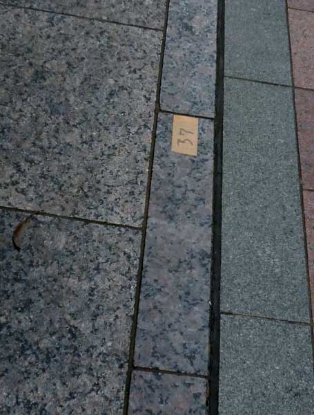 天神ビル街の道路に張られた謎の番号。ガムテープみたいなものの上に数字が書かれている。明後日から始まる「どんたく」の屋台設置場所?3年前、この37番あたりで屋台のホースに乗り上げ自転車で転倒!左腕と肩を骨折した嫌な思い出がある。しかし絵になりますね~!