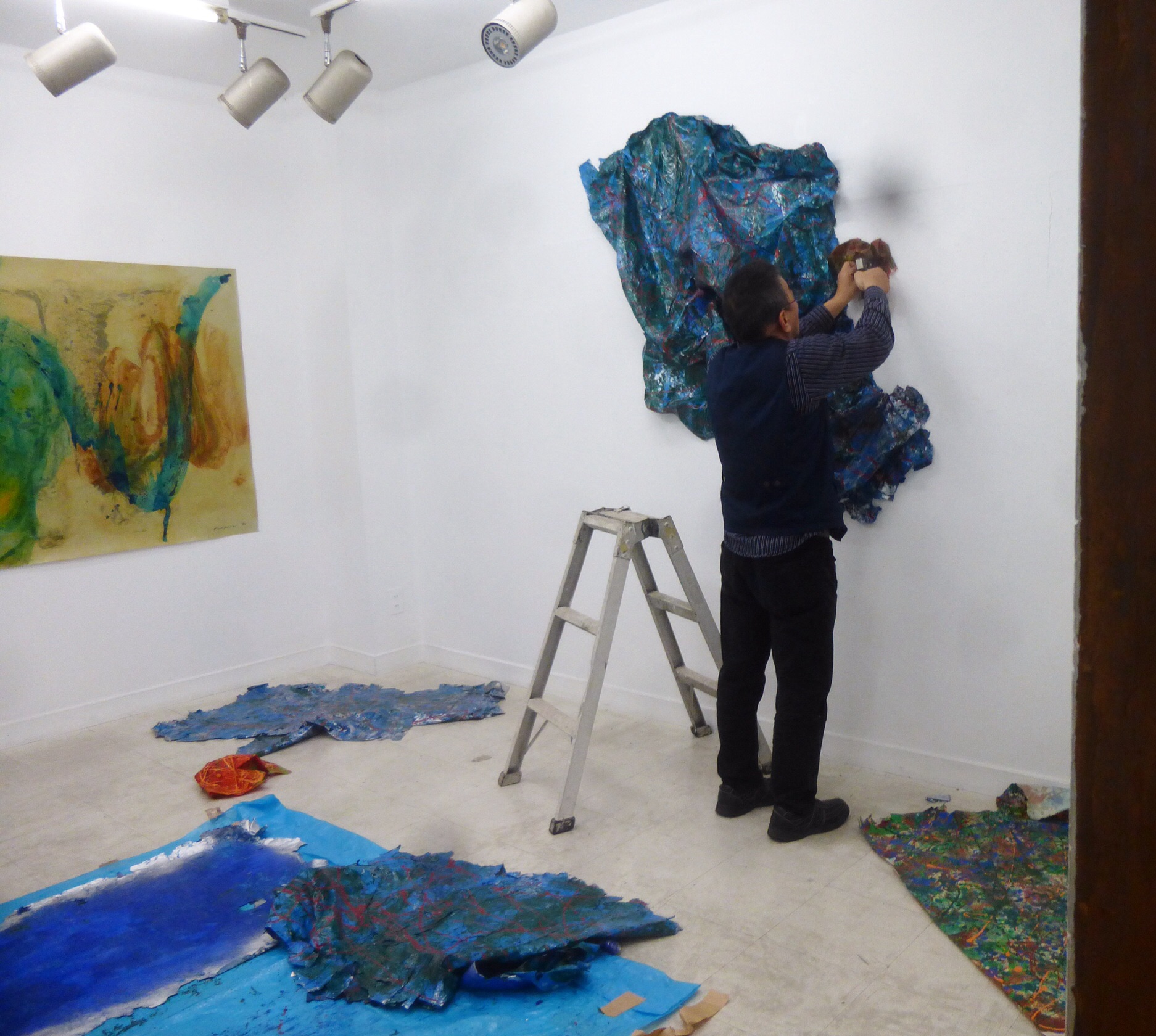 「展示、格闘中」 栗山さんが交通渋滞に会って飾り付けが遅くなりましたが屋根裏貘が忙しかったので律子さんの手伝いが間にあいました。2人で頑張っています。 http://artspacebaku.… 獏instagram.com/p/Ba1a-Y8DZNM/