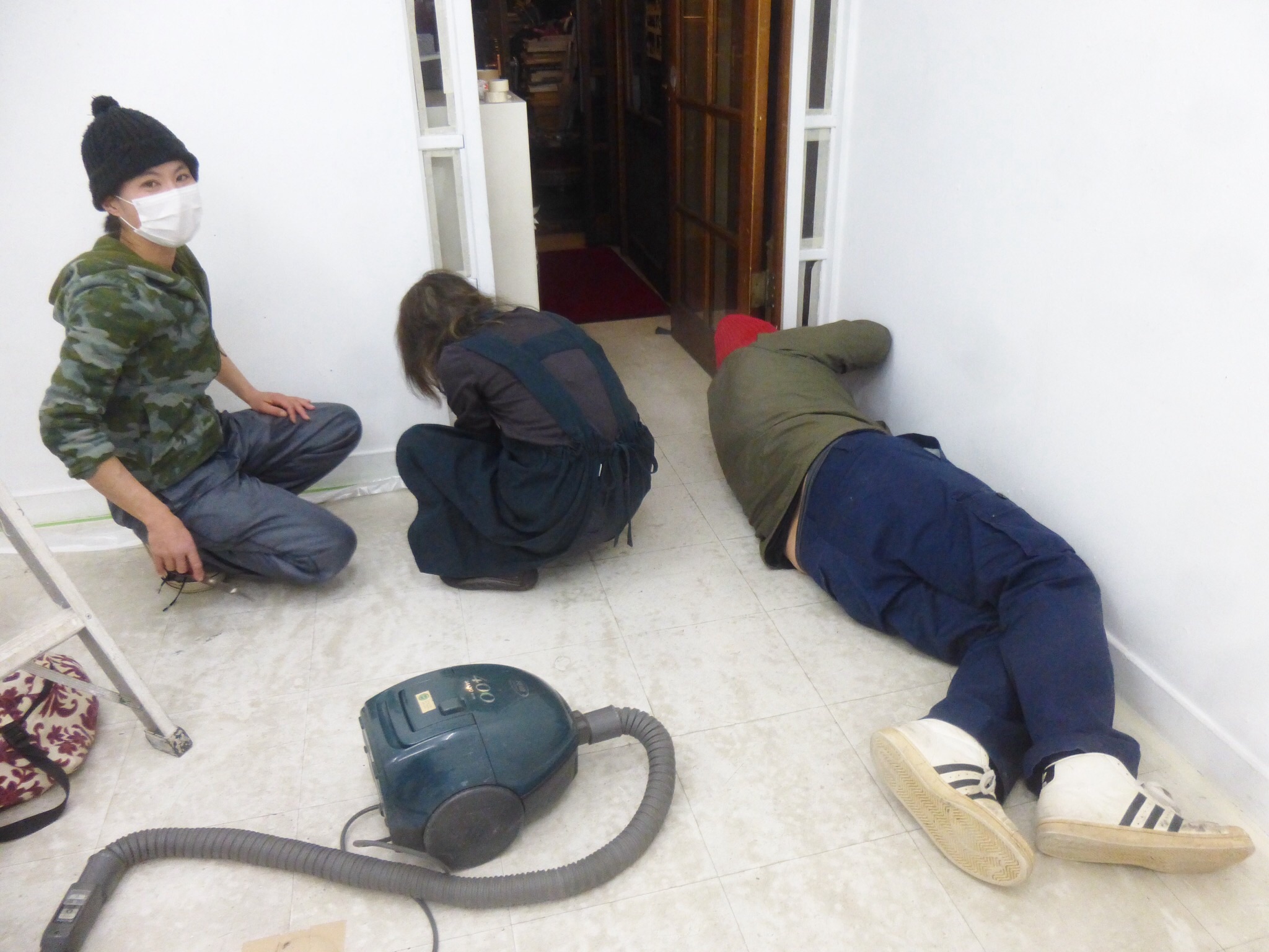 「画廊も化粧直し^ - ^」 2017年の画廊も終わりました。この日は最終展示が終わった3人展の阿部さんと宮野さんがペンキ塗りを手伝ってくれて壁が綺麗になりました。マスクしているのが阿部ちゃん、横になっているのが宮野さんです