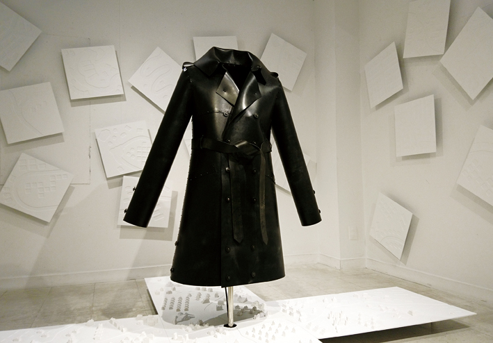 十字路のような板があり、またその表面にも道路の凹み、住宅やビルのようなミニチュアが無数に配され架空の町並みをなし、さらにその交差点上にはこれらのジオラマのスケールからすれば巨大な、ともいえる黒く部厚いゴム製のトレンチコートが突き立てられている。