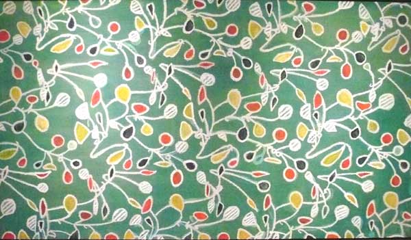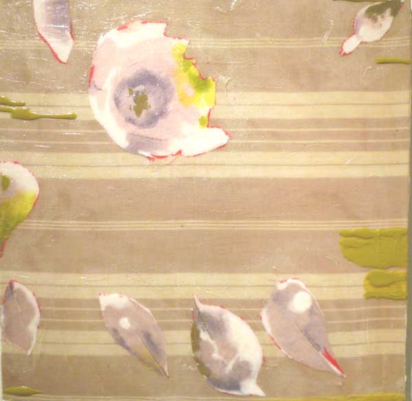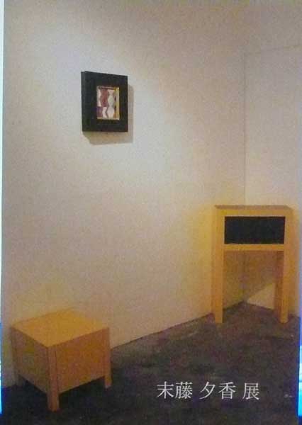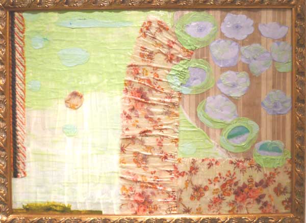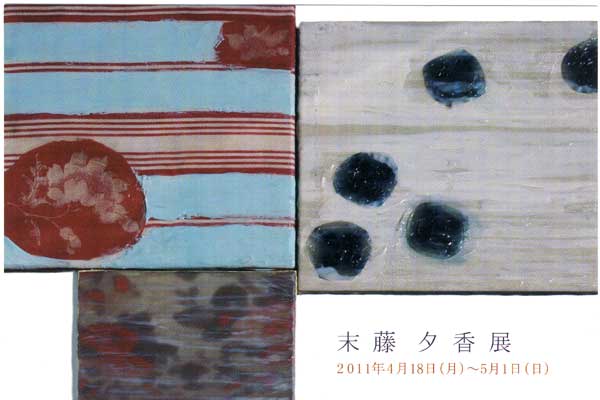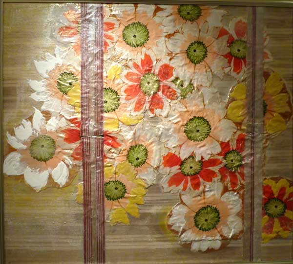 今回はカーテン地、ドレス、帯など日常に使われている布を使っての作品10点を展示。外国製品が70%、帯や古い可愛い柄の日本の生地。それらをコラージュし上からペイントしてある。全体に花がモチーフにされ春のような明るい雰囲気が醸しだされている。ペイントされた表面を半透明のメジュウムで覆っている。この不透明さは末藤氏の作品の根底にある「曖昧さ」=「エロス」を表現するのに有効である。実際に使用された布(実)プラス絵画表現(虚)が同一の平面に包含されていることを可視出来る。しかも不透明さが曖昧さを増加させ出来上がった作品に神秘性を与えている。今回のメジュムと花柄がケーキみたいに盛り上がって美味しそうという別効果もありました。
