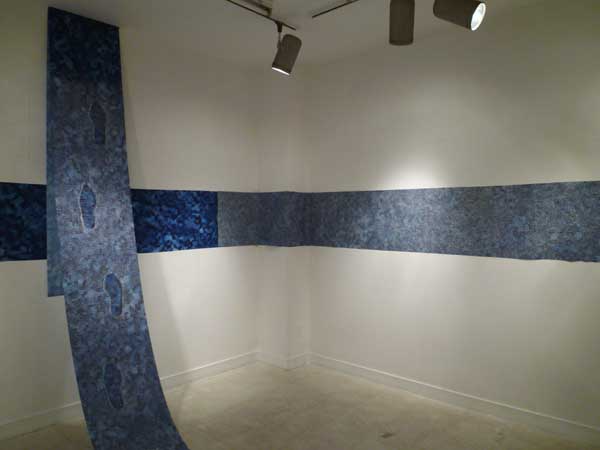 海岸の砂をデジタルで撮影、「超低画質」で布にプリント、その上にアクリルとぺんで手描きを重ねる。一粒一粒の質感を思いながら描いていく。そこにデジタル社会の中で生き延びる自分自身を重ね合わせる。