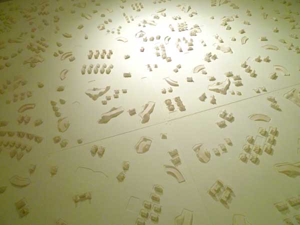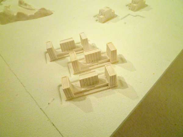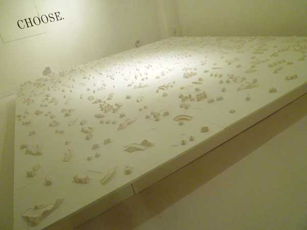 今回の展示は(人生ゲーム)に使用されているシーンから建物等をモチーフにしている。白い世界を表現することによって没個性というか人生が始まる無垢な状態を表わしている。かすかに聞える音はルーレットの回転音。勝ち残るのは誰?負けるのは誰?人生の意味深なコンセプトを作品にしています。