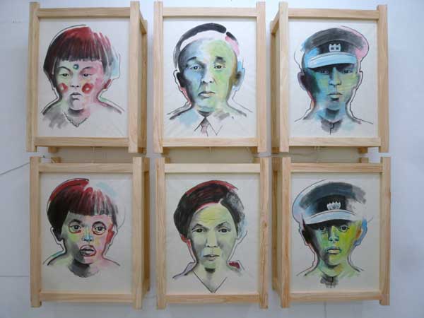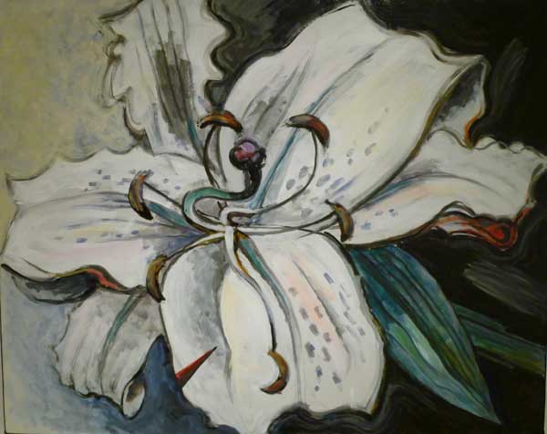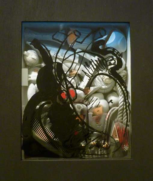 16年前に亡くなった妻麻子さんの着物や玩具を素材にしたオブジェ3点、庭にある蝉の抜け殻を黒い木枠の棺桶に見立てた箱に入れた7点の作品、咲いて枯れていく百合の花の姿を11枚の「連続絵画」にしている。