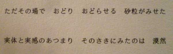 2010年12月大阪・本町のギャラリー「gallry・月夜と少年」での個展での記録映像。絵を描く途中で部分を削除・増殖を繰り返し最後には消滅させるというパフォーマンスを公開。絵そのモノに価値があるのか,絵を描くという行為に価値があるのか現代美術の問題を提議しているように思える。