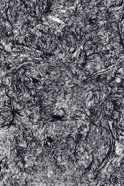 彼の心の命ずるままに手が動きそこに紡ぎだされる線と形、時には抽象的に、時には具象的に表出する。時には悪魔ともいうべきエロ、グロが表出され、時には天使ともいうべき爽やかな軽やかな細い線が表出されるが天使の形は見えてこない。見る側に天使と語ろうという魂ががないから天使の姿が見えないのか?見せる見るという作家と観客との間に不思議なコミュニケーションが対峙する。もしかするとタイトルに幻惑されて悪魔だけがいるのかもしれない?現代人の危うい精神に何かを提示しようとしているのだろうか?今回初めて黒ではあるが強いアクセントが画面に素晴らしい陰影を与えている。