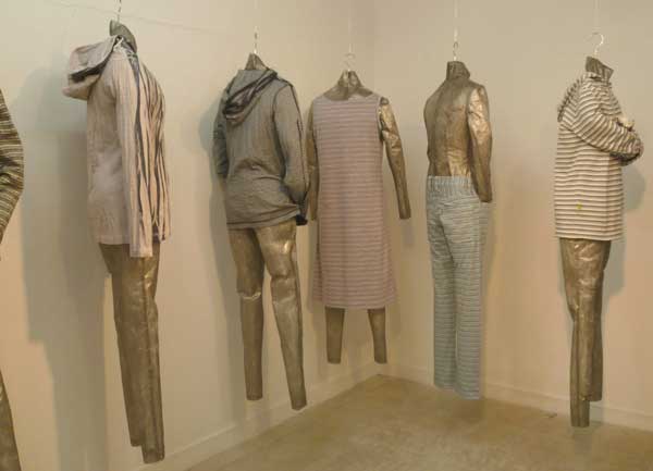 進化する20体の残糸のシャツを着た20体のボディーを展示。大量生産の過程の中で残ってしまった残糸を使って新しくオリジナルなデザインの一点物を創作しようと試みるのが三宅一成デザイン事務所に勤めていた浜井氏です。大量生産と一点ものという矛盾を「皺を加えて」新しい価値が生まれないかをテーマにしている。