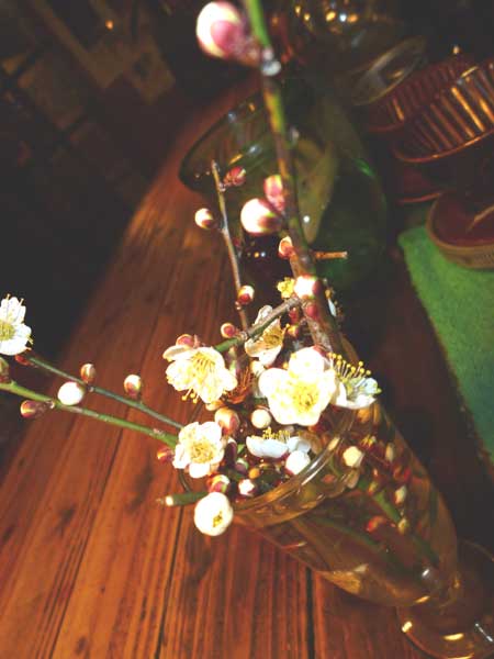 大宰府では飛び梅が咲いているらしい!まだ4分咲き?獏ちゃんちでも昨日のパーテイで各テーブルで梅が咲いていました。