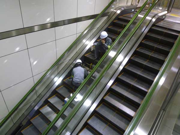 夜中に修理をする人。ご苦労さん!普段目に付かないところで働き安全を守る人達!エスカレターの修理は余り目につかなかった!