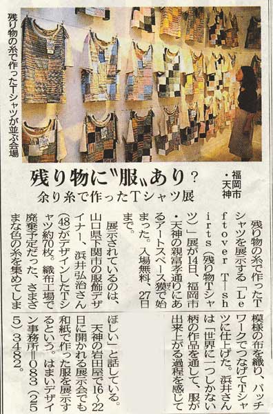 本日の西日本新聞に浜井弘治作品展の記事が載りました。おかげで見に来るお客さんが多くて、高額なシャツも売れました。世界で一品という価値があるからかな?