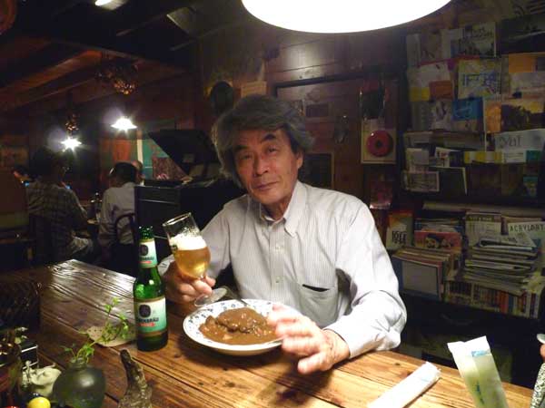 もう製造していないレーベンブロィ!獏の最後の一本を飲むダンデイな男性は産大の河地先生。野村佐紀子のDMのデザインを毎年、やってもらっています!