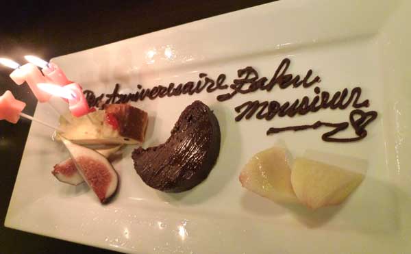 仏蘭西語でムッシュといわれ、仏蘭西語で「誕生日おめでとう」と書かれたケーキを初めて食べてご満悦!翔子ちゃん有難う!いちじゅく、桃それとチョコレートは良く合いますね!