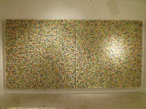 只今、個展中の山口寿美代さんの作品!壁面一杯に飾られたこの作品、本人に内緒で計算してみると3万個?明日5時まで開催しています。見て確かめてください!兎に角迫力に満ちてます。