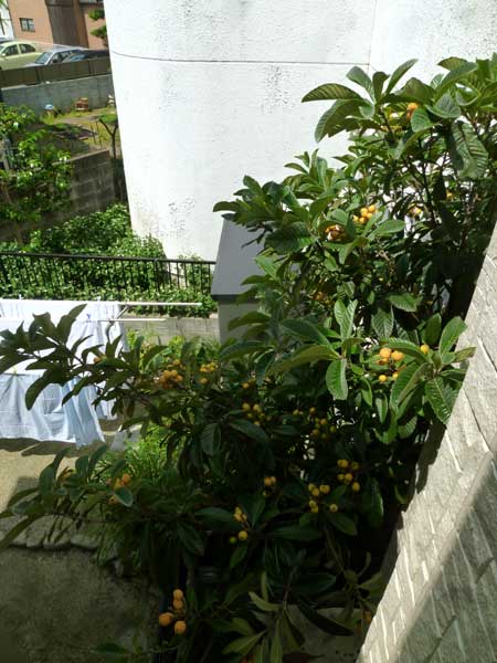律子さんが食べた枇杷がおいしかったから種を捲いてたら10年目にして初実り!ことしはじめて実がなった。味は良いそうです。2,3日後に収穫予定?待ったというより忘れていた、棚からぼた餅?いやいや、律子さんの用意周到のなせる業!