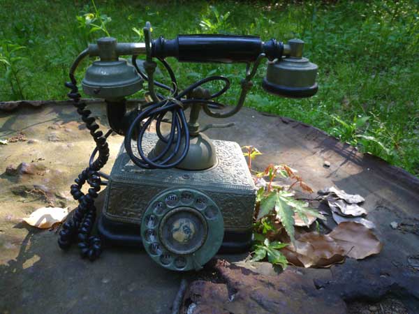 まるでブラッド・べり-の「永遠の夢」に出て来そうな電話機。これは古の人にかける専用の電話機です。このお洒落なテレホンはまだまだ使えるそうです。電話線につなげれば過去も、現在も、未来もつながるかも?この古い電話機はキタムラケイさんの持ち物です。獏のピンク電話よりも古くお洒落です。そしてこの日は森への散歩にお出かけでした。様になってる!
