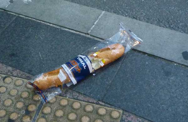 中途半端な存在?中が少し食べられているから、食べて買い物袋に入れたつもりで落とした?味見してまずかったから捨てた?謎多きバケット!ちなみに発見は朝でした。