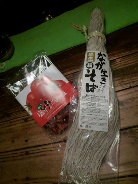本日。町内会の組長慰労会で律子さん小旅に出かける。お土産にこの2品。塩トマトの甘納豆と長生きソバ!トマトの甘納豆は微妙な味でした。珍しいもの食べたから長生きするかな?しかも追い討ちかけるように長生きソバ。寿命より2日長生きすることは間違いなし!!
