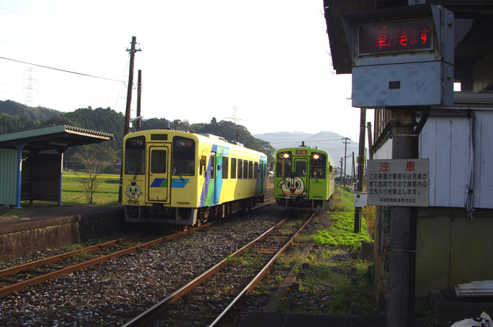 田舎の駅ですれ違いの一車両編成の電車同士!可愛いです!